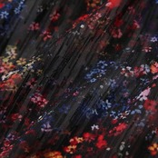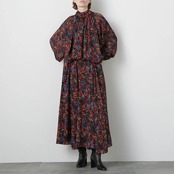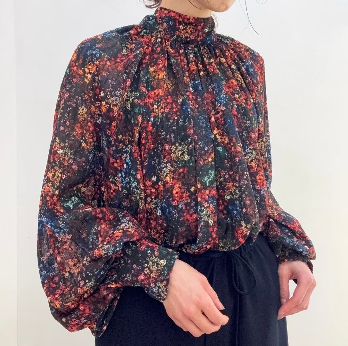 無地ではなくジャカード生地にプリントを重ねることで、立体感のある豊かな表情を実現しました。ハイネックとたっぷり分量の身頃・袖が女性らしいシルエットを演出し、太めのボウタイが印象的。後衿と袖口には同素材で包んだ華奢なボタンを配し、繊細さと大胆さを兼ね備えています。