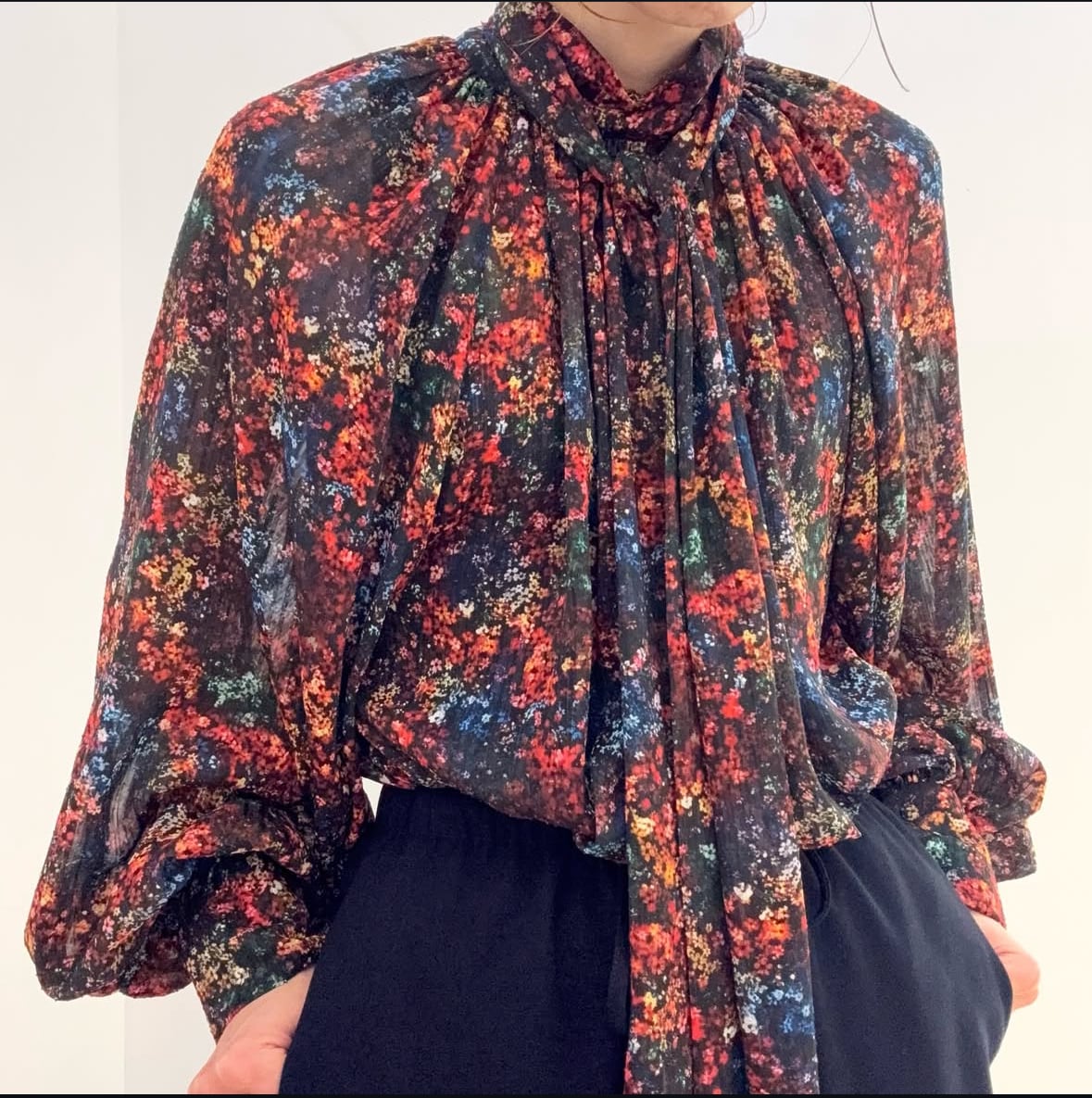 オリジナル転写プリント素材を贅沢に使用したボウタイブラウス。