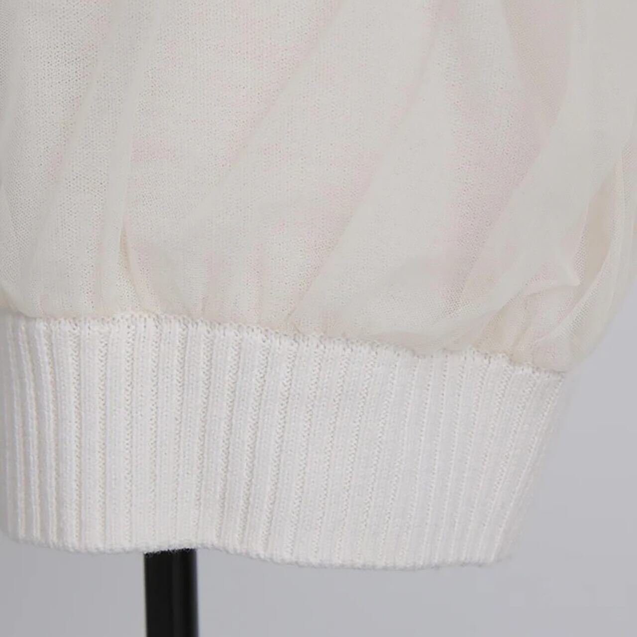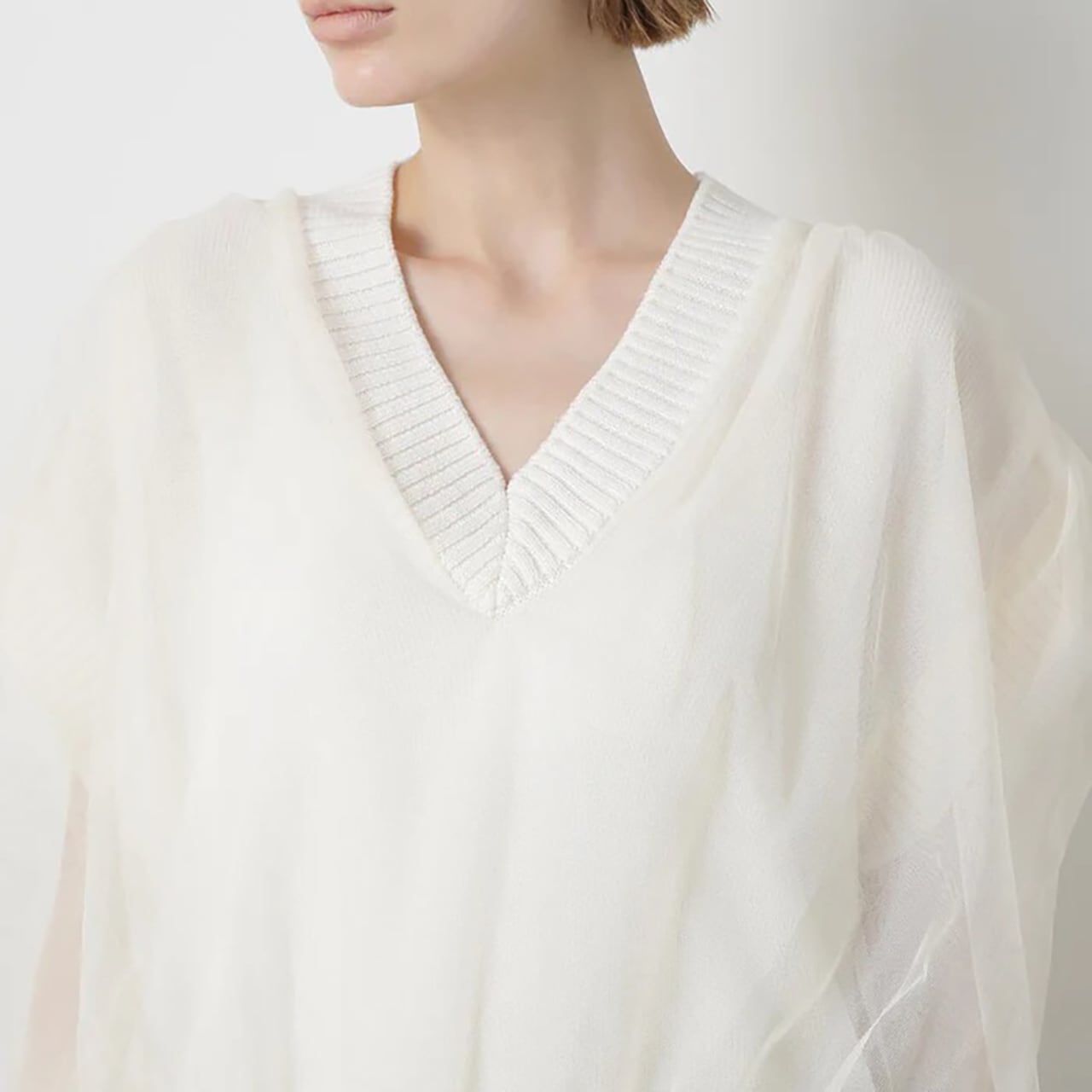 ウール100%の柔らかな糸で編んだVネックジレに、同系色の軽やかなポリエステルチュールを組み合わせました。まるで色がにじんだようにふんわりと広がるチュールが、ニットの周りに華やかな立体感を生み出します。身頃は14ゲージの片畦編み、リブは5ゲージの2×2リブで仕上げており、しなやかで上質な着心地を実現。単体でもレイヤードでも映える、洗練されたエレガントな一着です。