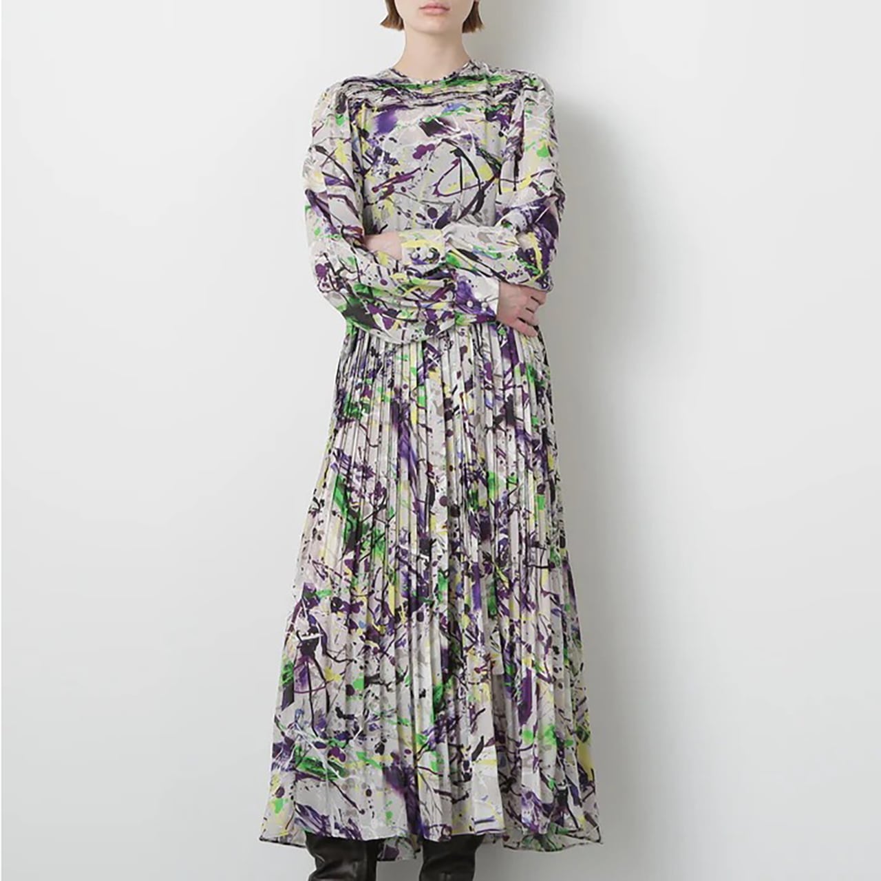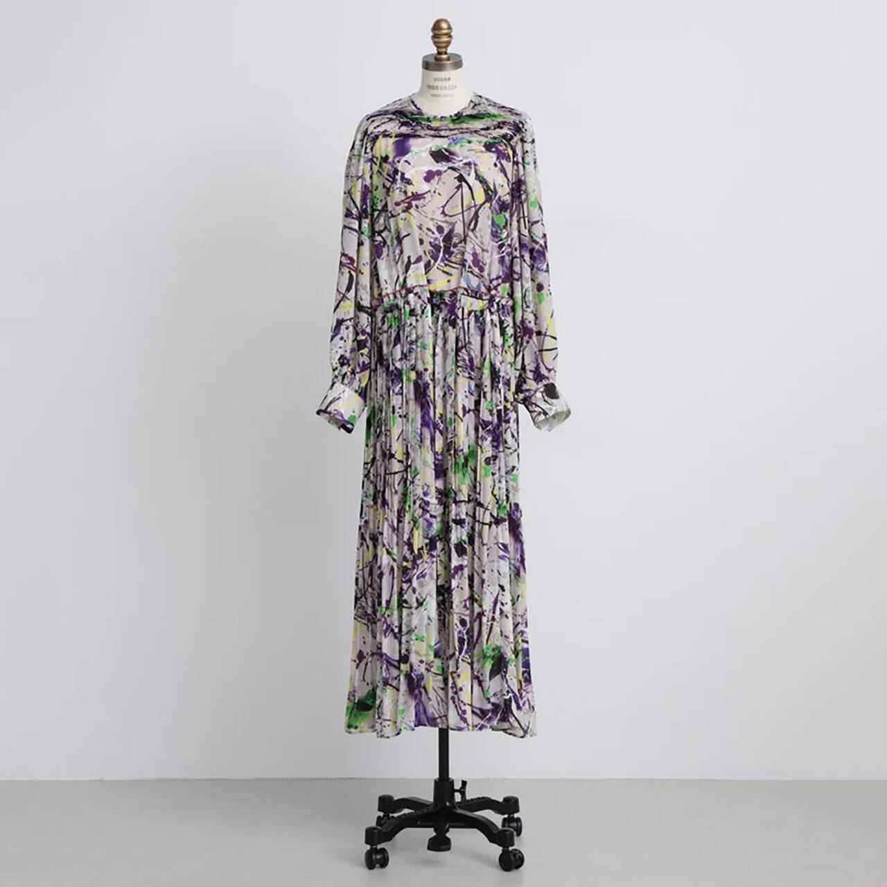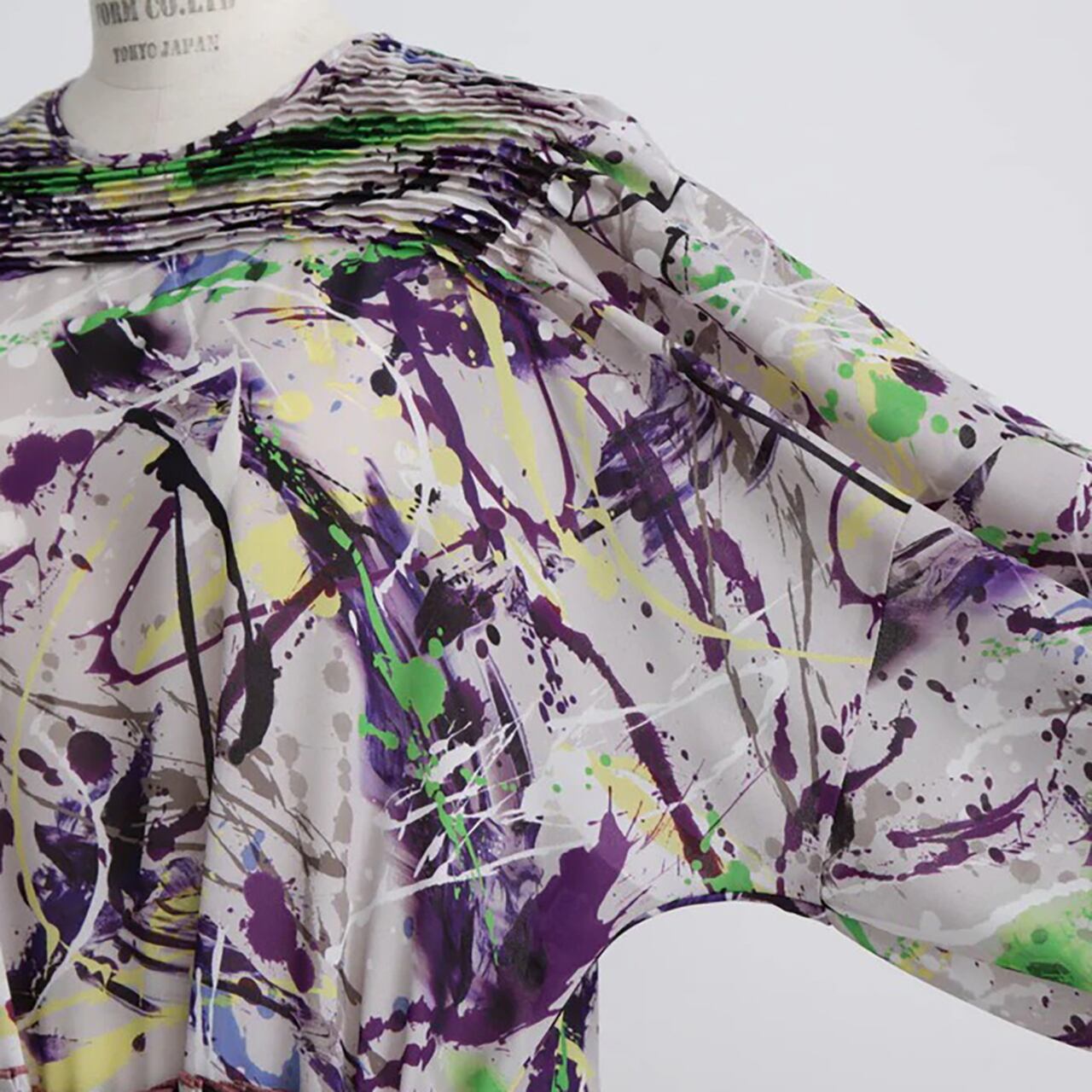 20世紀アメリカの抽象画家からインスピレーションを受けたインダストリアルなアートムードを表現したオリジナルプリントを用いたワンピース。衿から肩にかけて施した横向きのピンタックが華やかな印象を与え、顔周りを美しく演出します。袖はピンタックの分量を活かし、ふんわりとしたボリュームスリーブに仕立てました。スカート部分は縦プリーツでピンタックと調和し、統一感ある洗練されたデザインです。