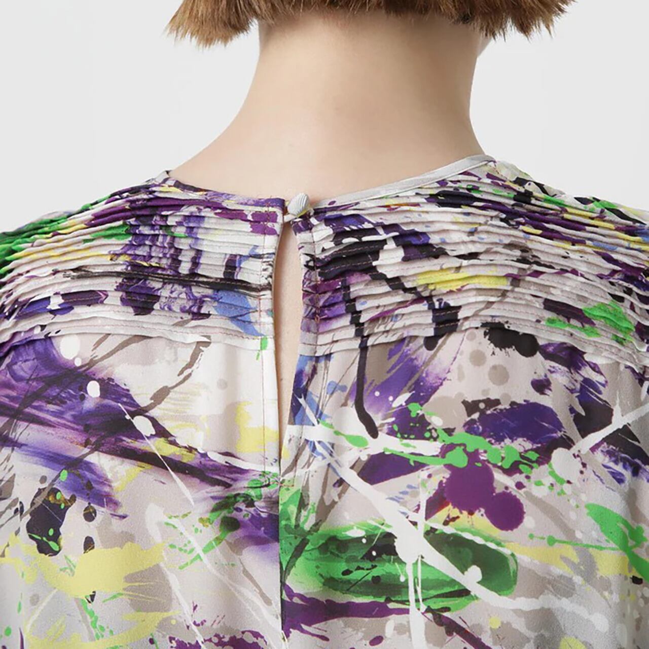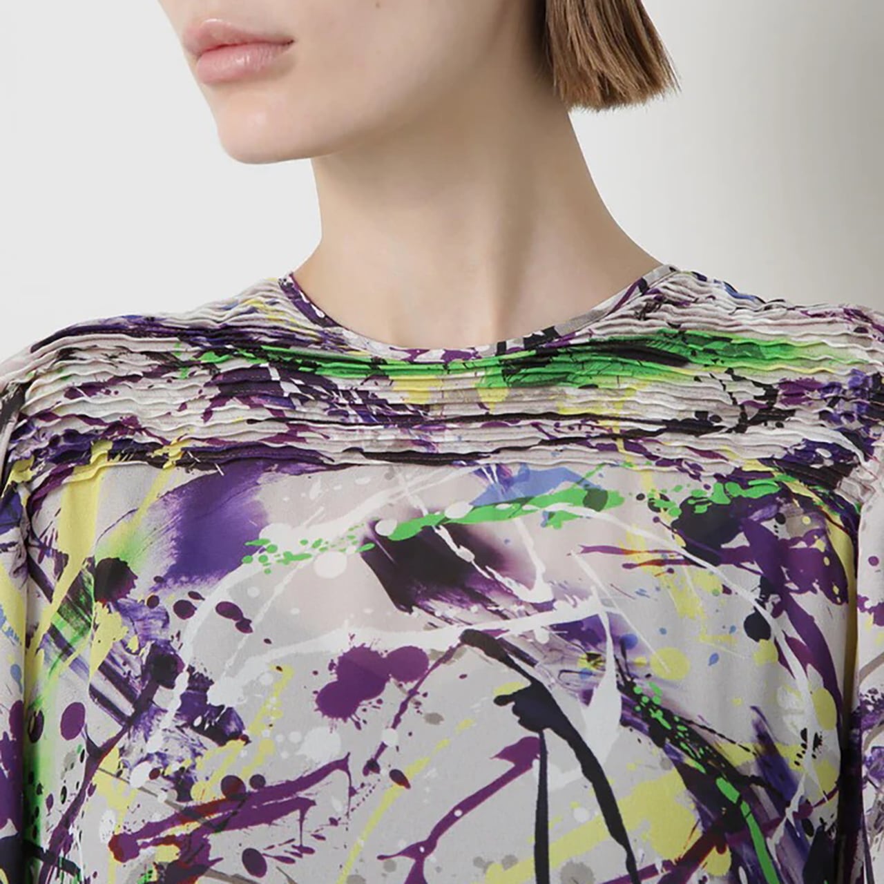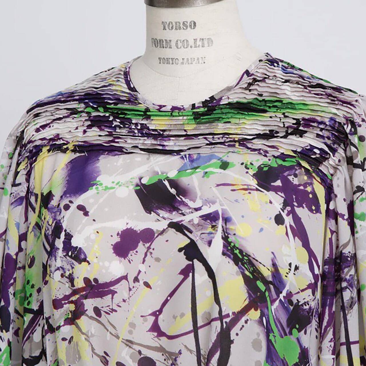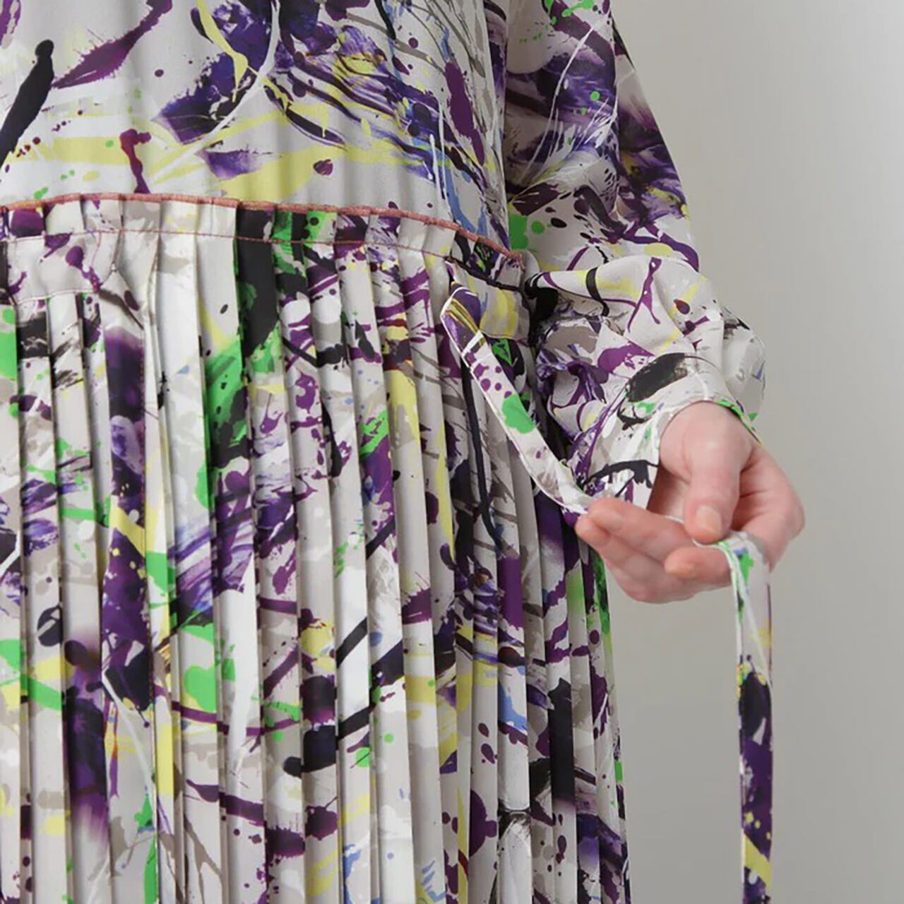 20世紀アメリカの抽象画家からインスピレーションを受けたインダストリアルなアートムードを表現したオリジナルプリントを用いたワンピース。衿から肩にかけて施した横向きのピンタックが華やかな印象を与え、顔周りを美しく演出します。袖はピンタックの分量を活かし、ふんわりとしたボリュームスリーブに仕立てました。スカート部分は縦プリーツでピンタックと調和し、統一感ある洗練されたデザインです。
