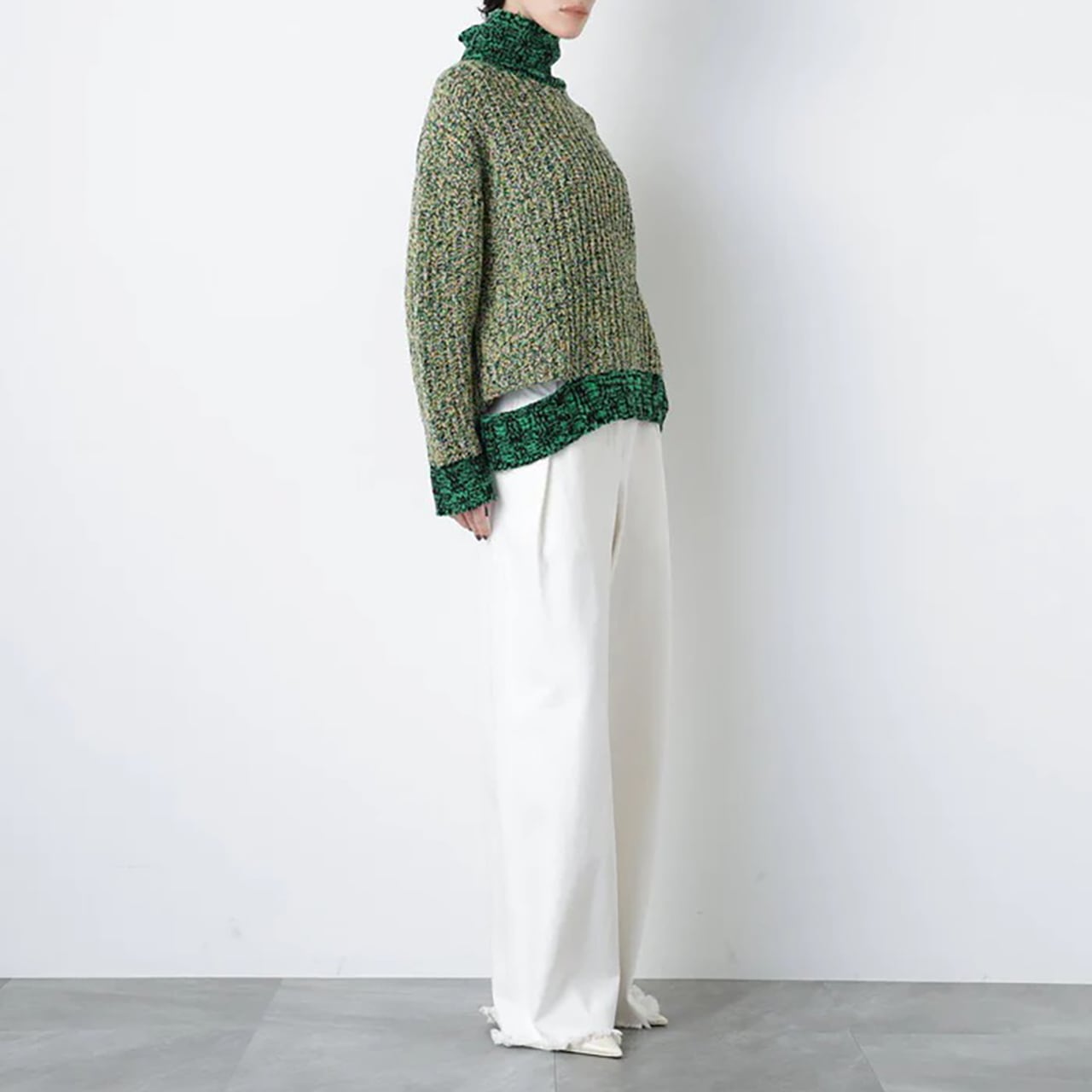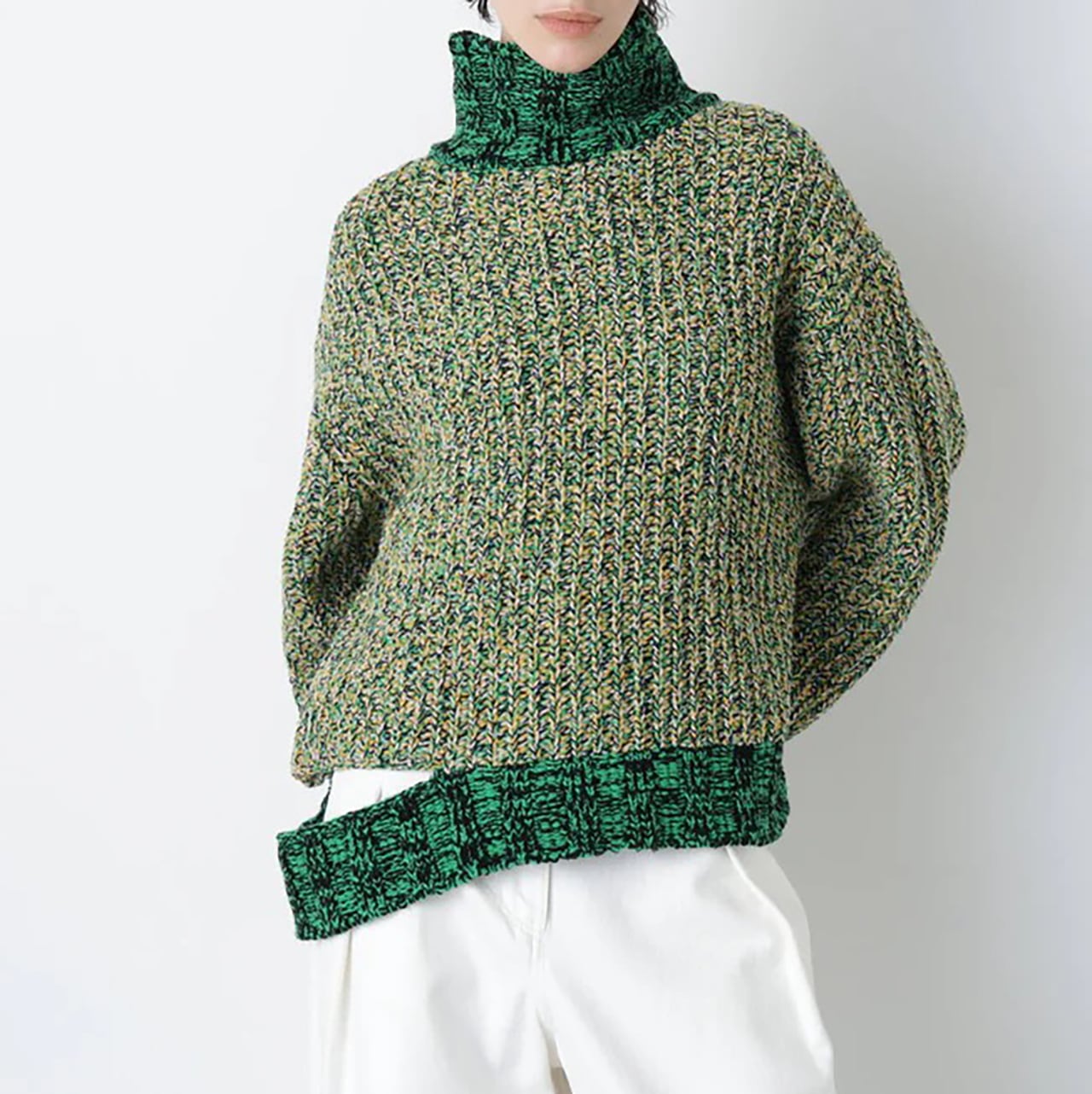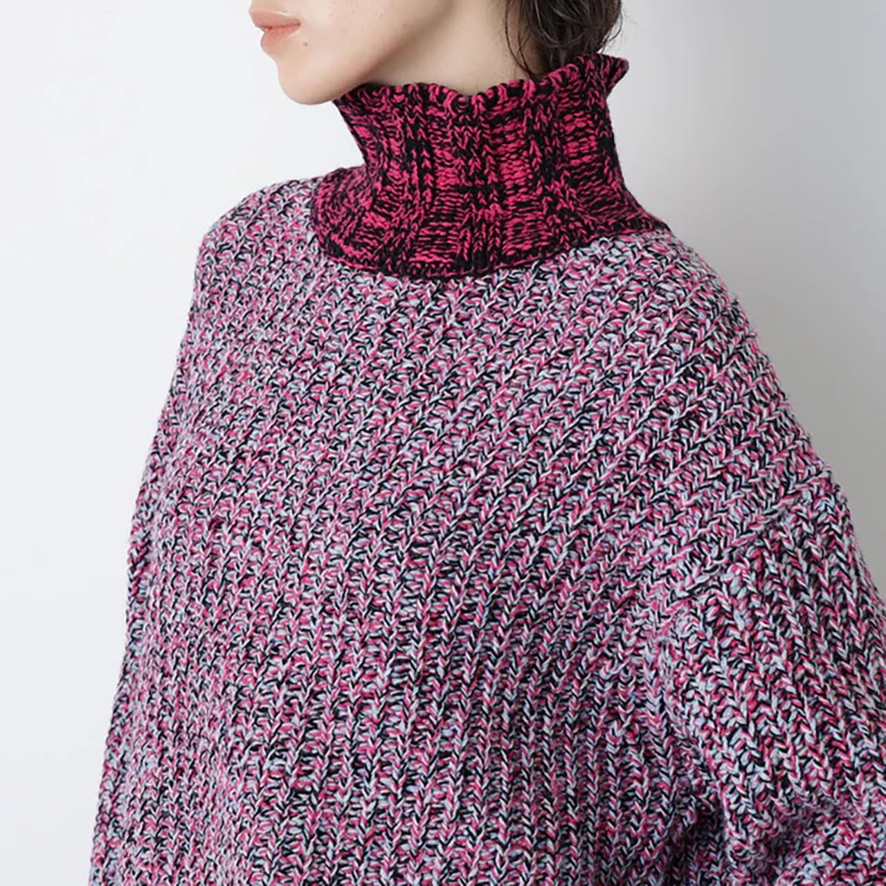 ゆったりとしたハイネックとリラックス感のあるシルエットが魅力のローゲージニット。太めの糸を空気を含ませながら編み上げ、セーターらしい表情を持ちつつ軽やかな着心地に仕上げました。ピンク系とグリーン系はボディに4色の糸を撚糸したミックス感を生かし、衿・袖・裾には別で撚った2色ミックスヤーンを配して色×色のコンビネーションを楽しめます。