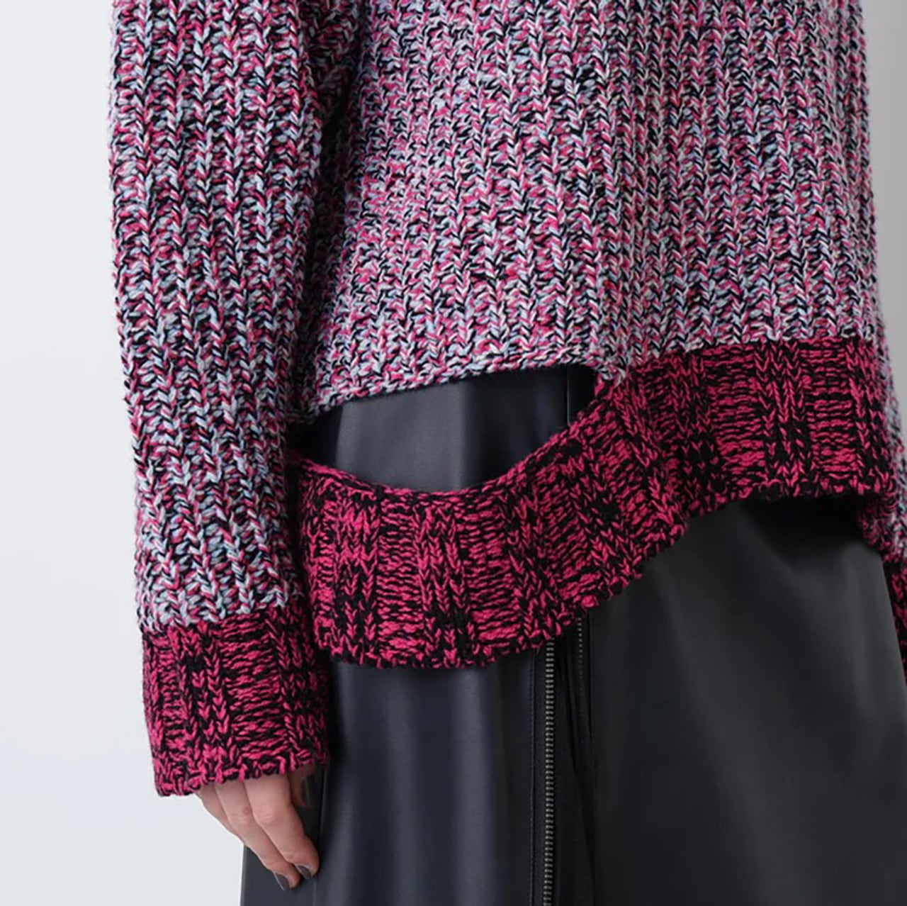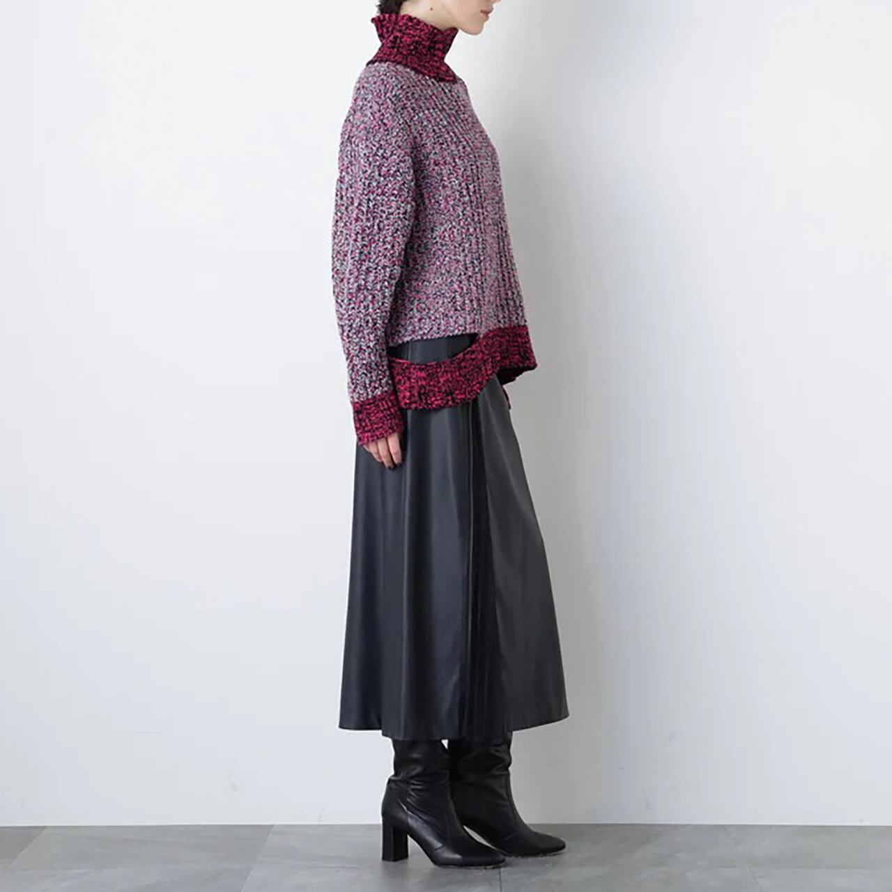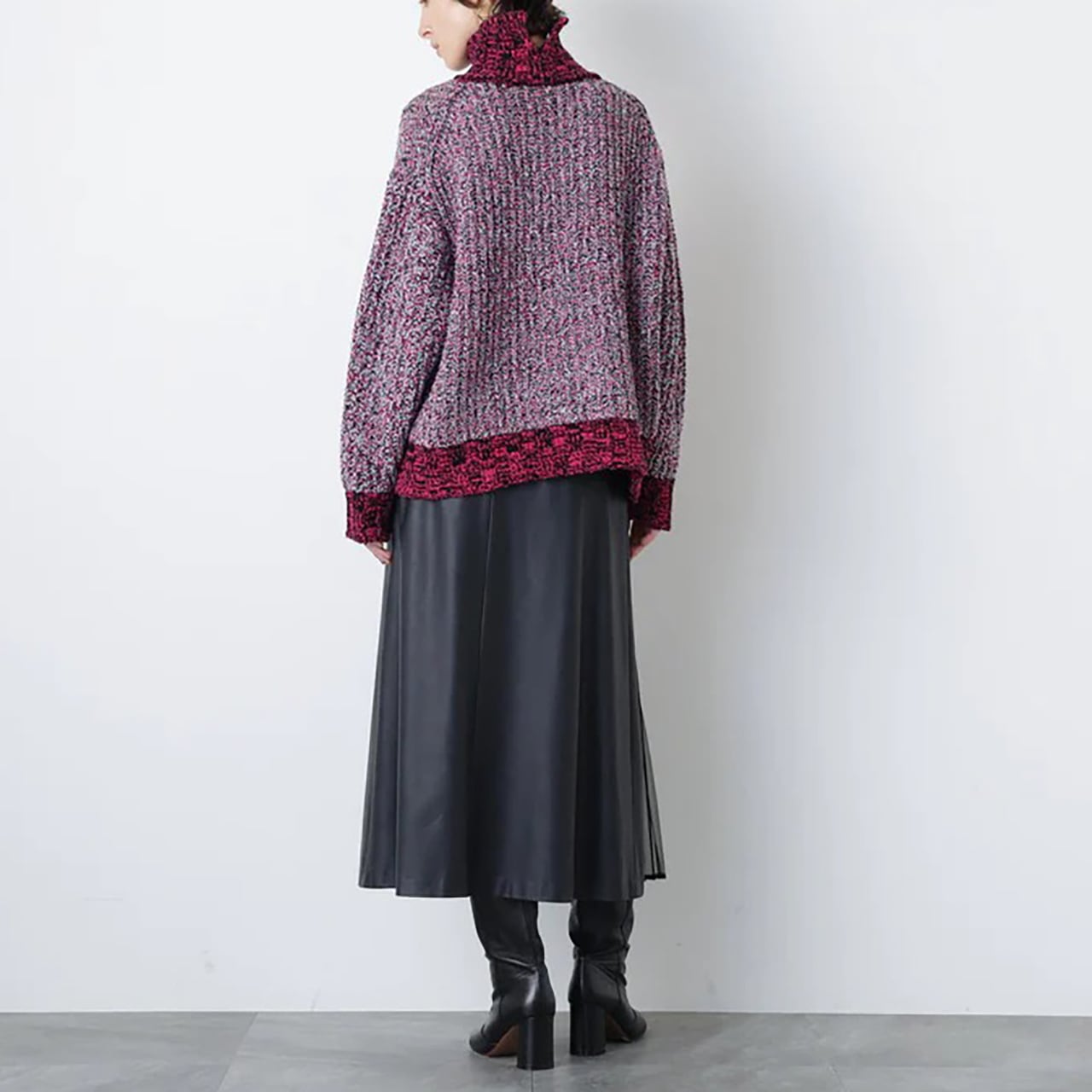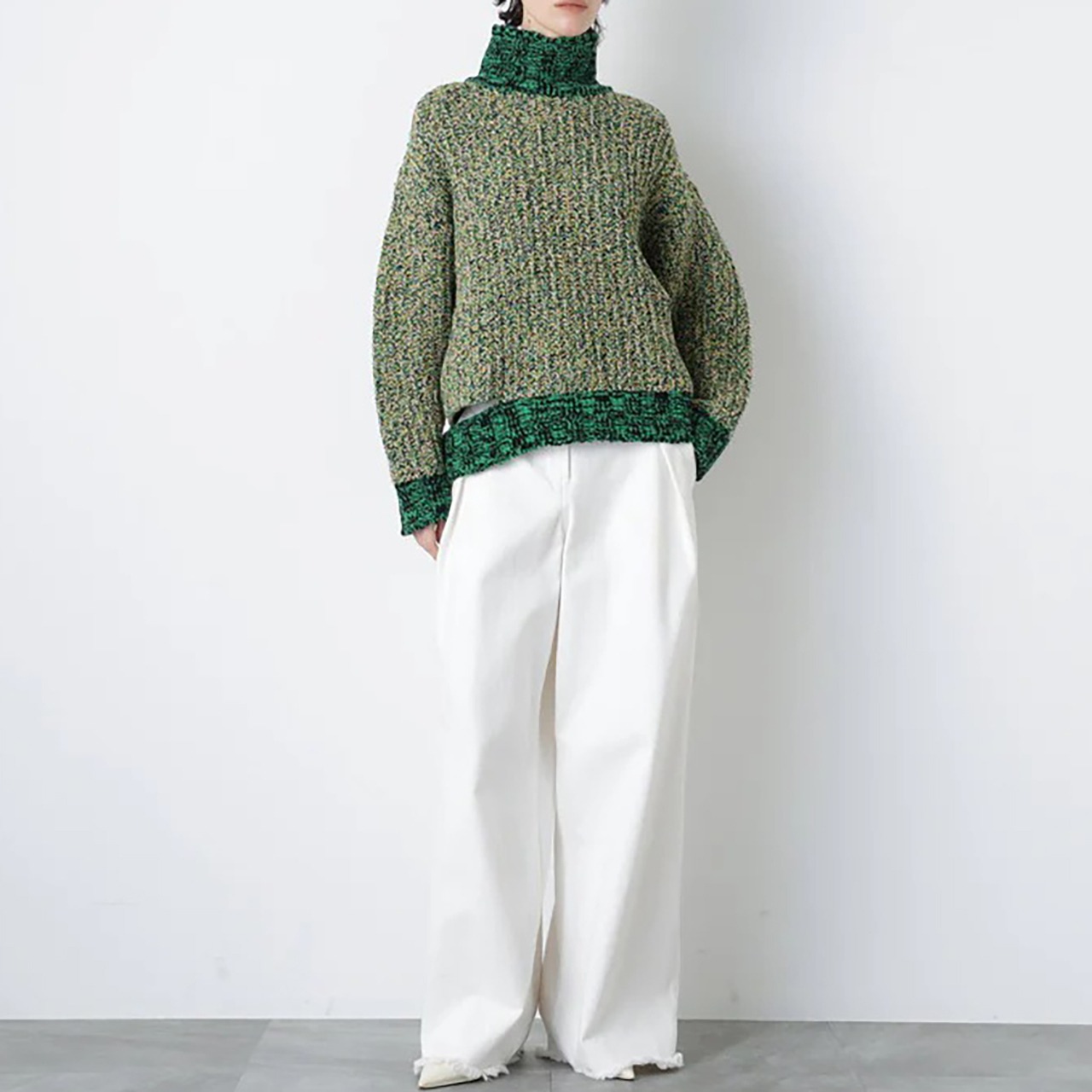ゆったりとしたハイネックとリラックス感のあるシルエットが魅力のローゲージニット。太めの糸を空気を含ませながら編み上げ、セーターらしい表情を持ちつつ軽やかな着心地に仕上げました。ピンク系とグリーン系はボディに4色の糸を撚糸したミックス感を生かし、衿・袖・裾には別で撚った2色ミックスヤーンを配して色×色のコンビネーションを楽しめます。
