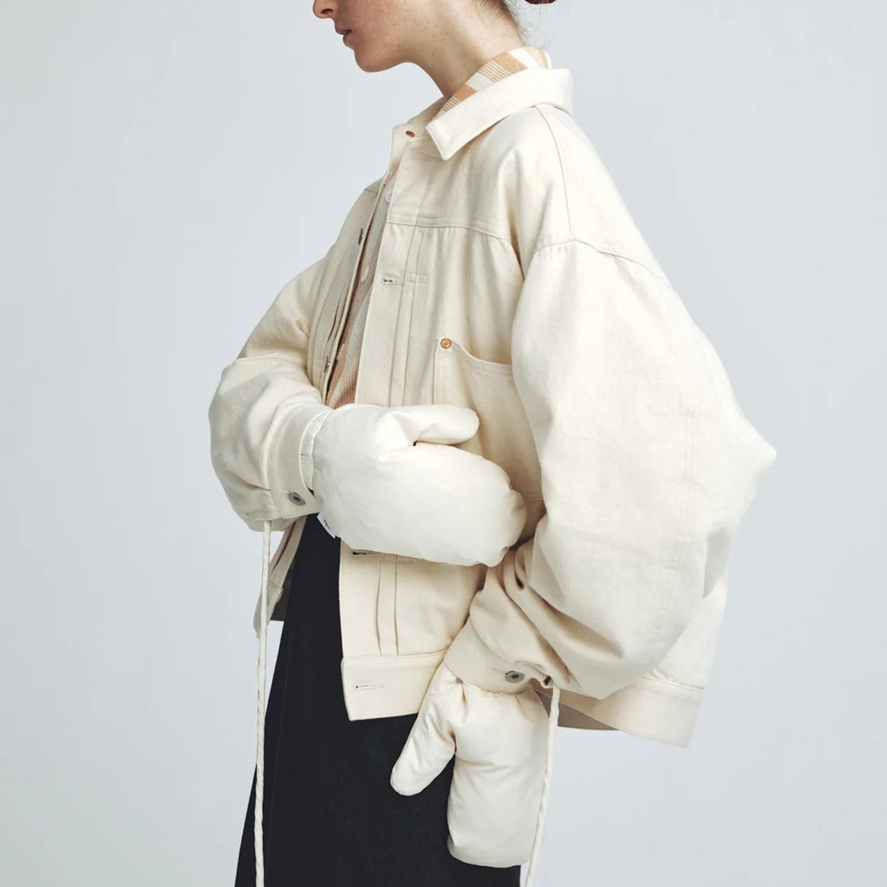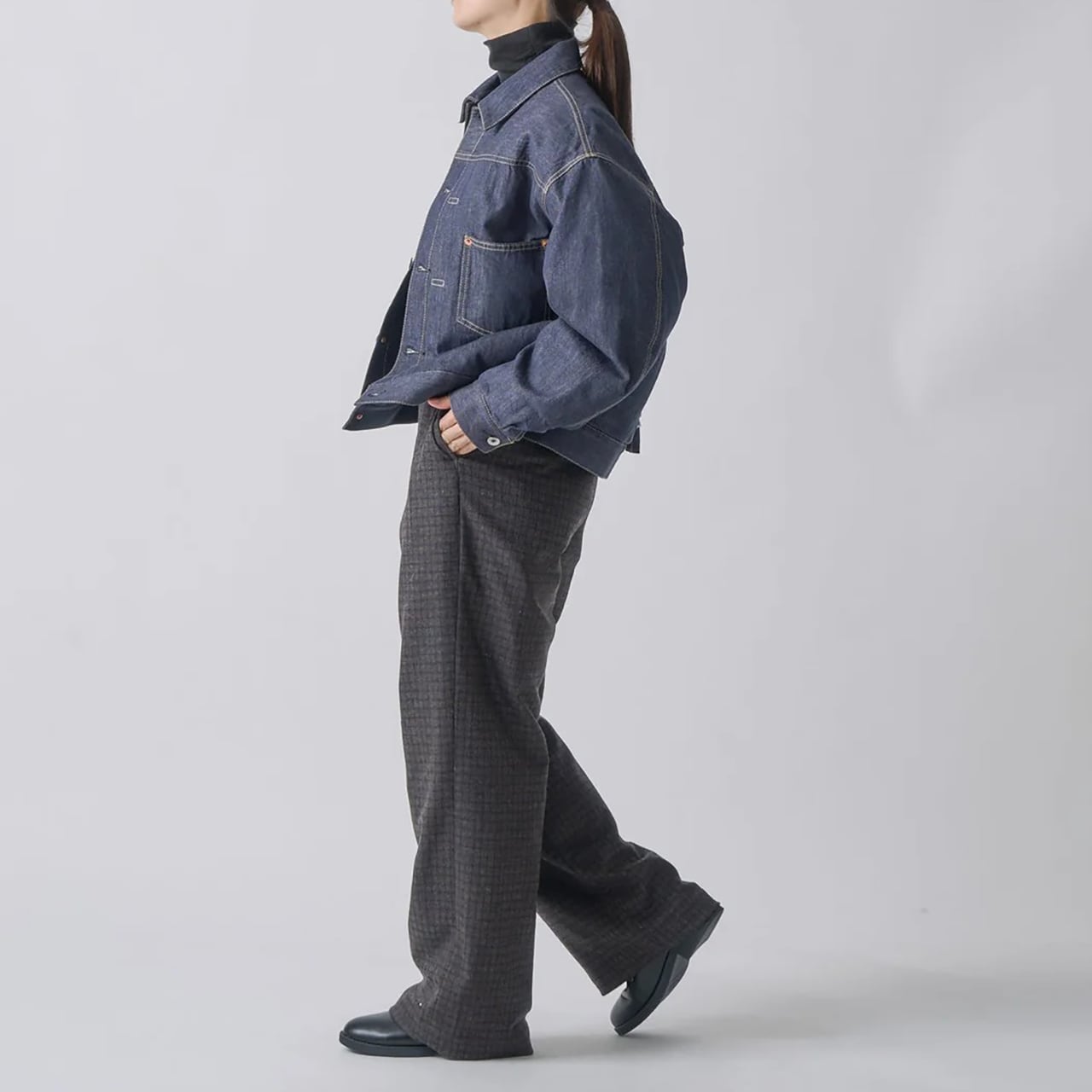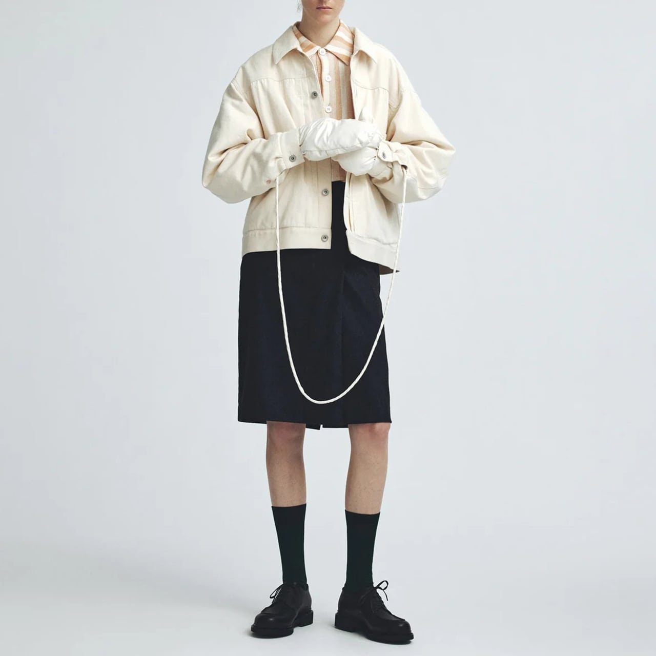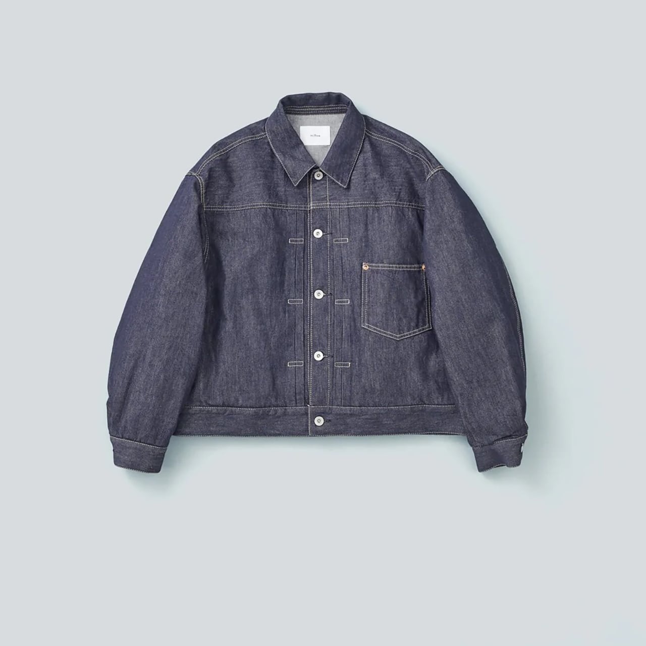 1940年代のヴィンテージモデルに見られる特徴的なディテールを取り入れつつ、ミニマルでソリッドな印象に仕上げたデニムジャケット。ダウン入りで保温性も確保。コンパクトな着丈とワイドな身幅のコントラストが独自のシルエットを生み、サイドシームポケットや背面のバックシンチで実用性と調整力も備えています。
