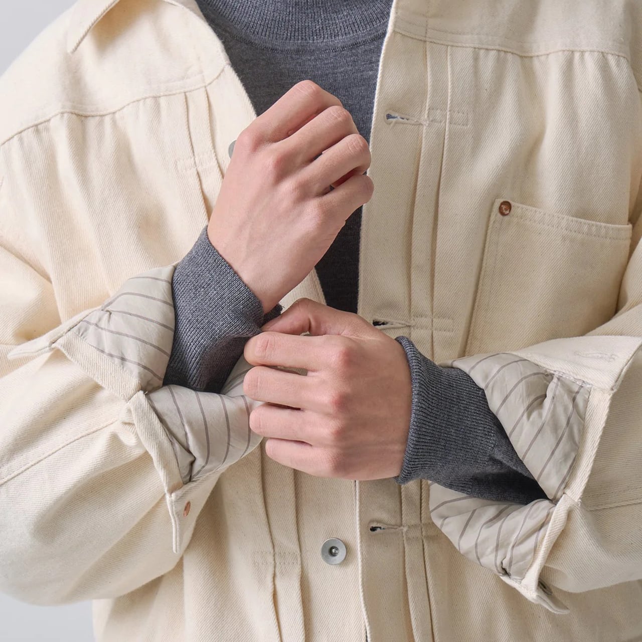 袖裏には吸・放湿性に優れ、肌触りが滑らかなキュプラツイルストライプを使用。そのままでも折り返してもおしゃれに着こなせます◎