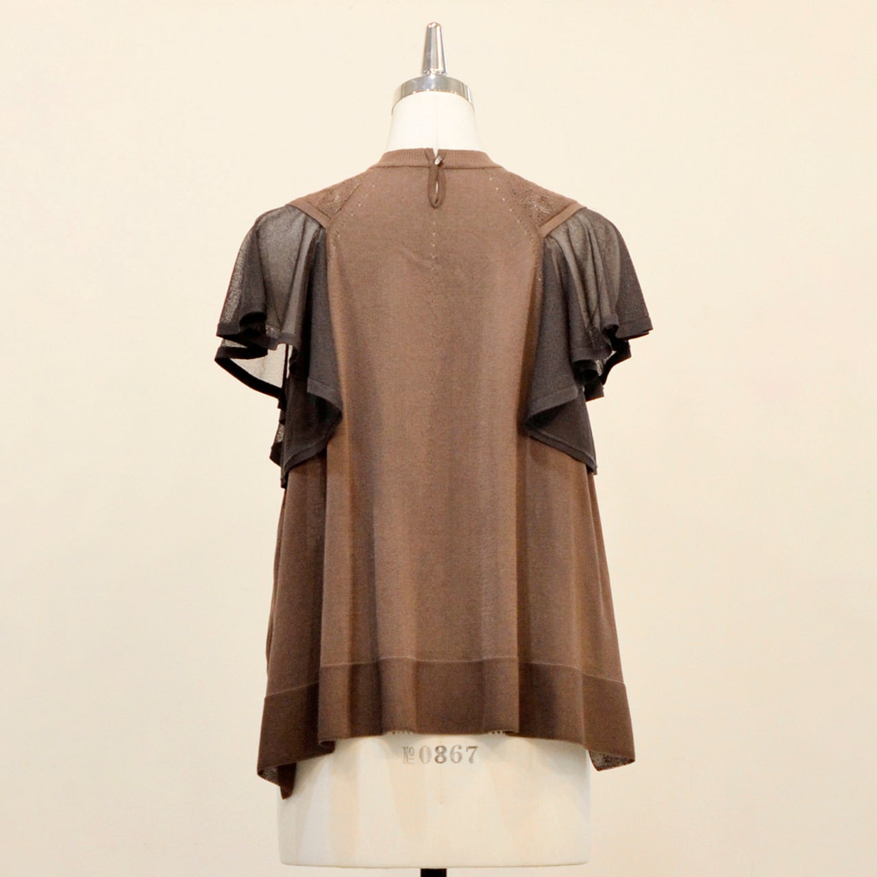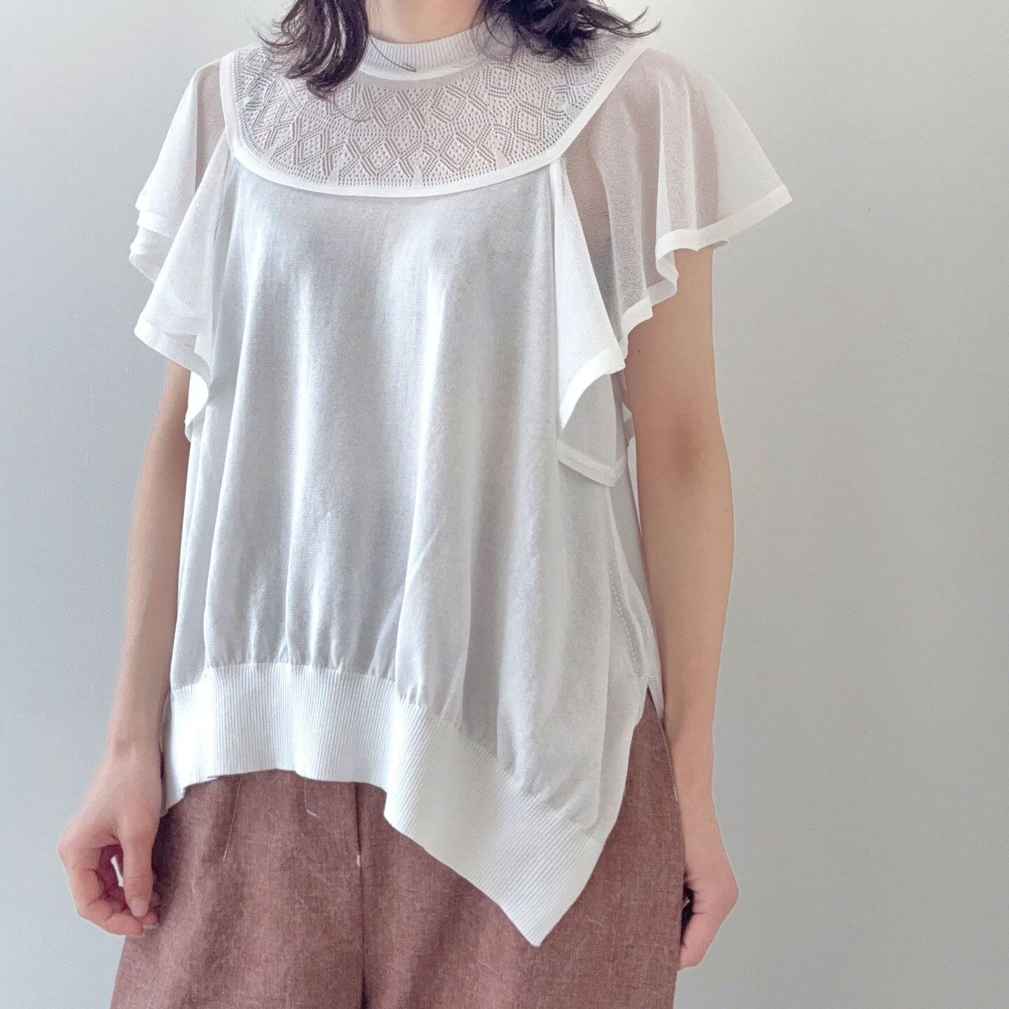 全体的に透け感のある軽い編み地を使ったプルオーバーニットです。